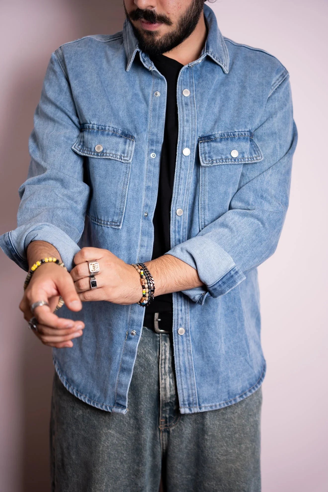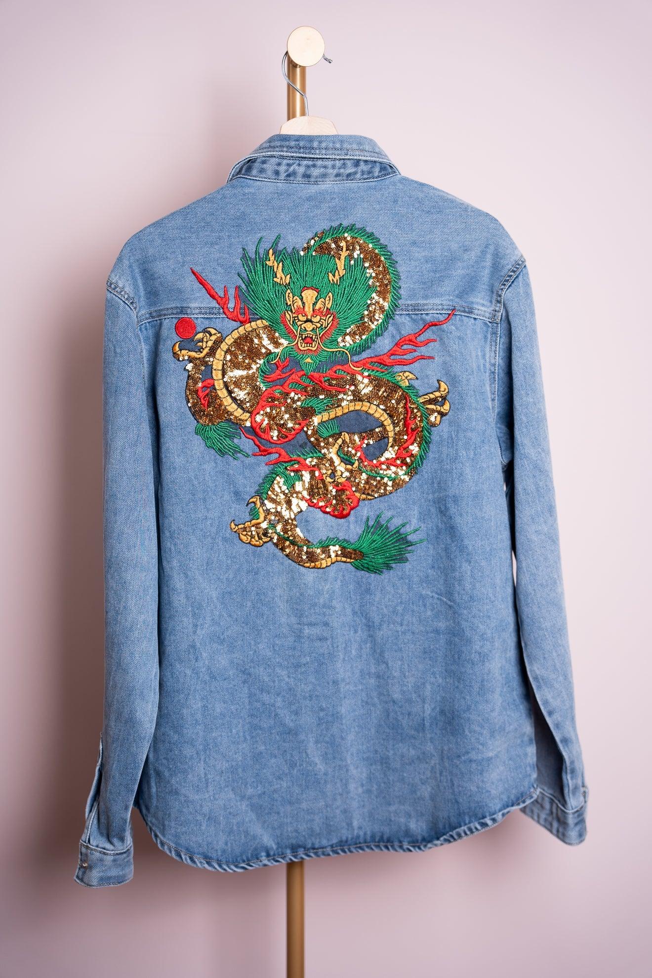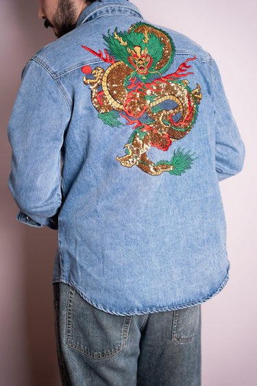 Camicia uomo in denim chiaro, con un’anima decisa e contemporanea. Il ricamo del drago sulla schiena domina il capo con forza e movimento, trasformandolo in un simbolo di energia e potenza.