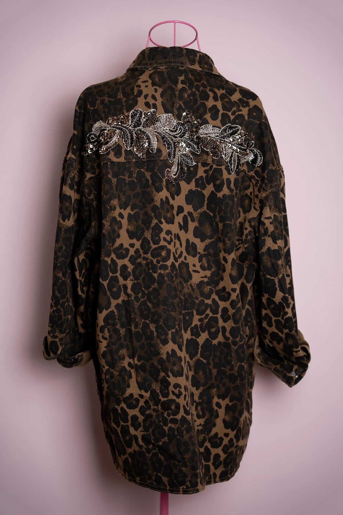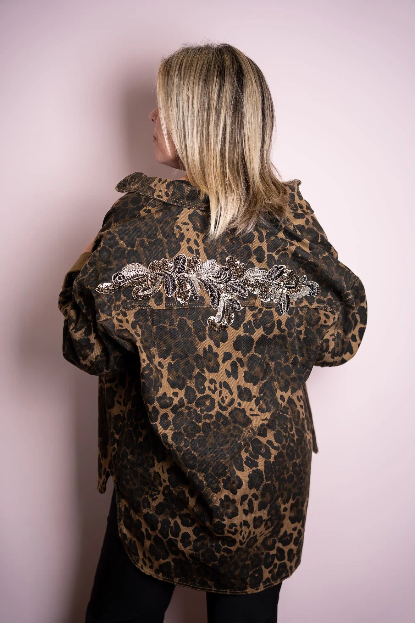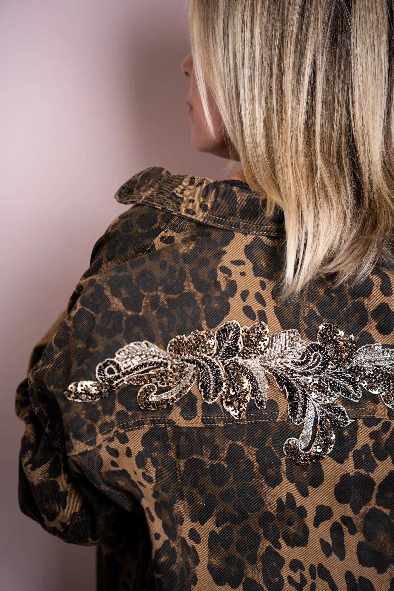 Camicia in denim maculato a maniche lunghe, dal carattere deciso e dallo stile inconfondibile. La schiena impreziosita da un ricamo floereale silver di perline cucite a mano aggiungono luce e originalità.