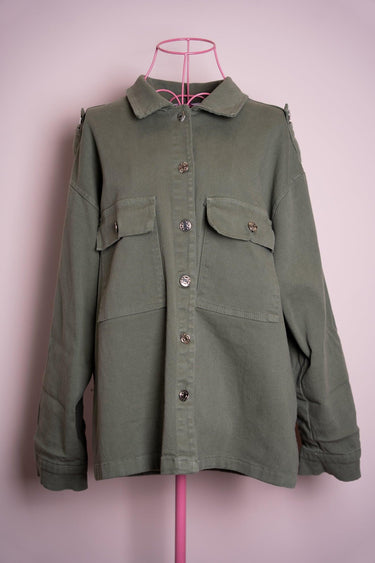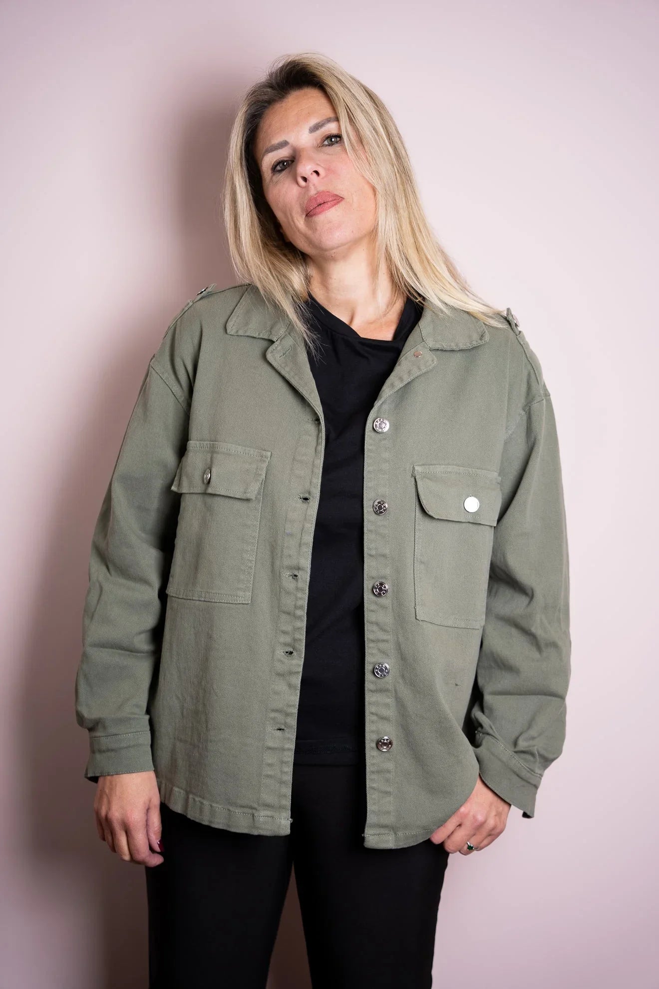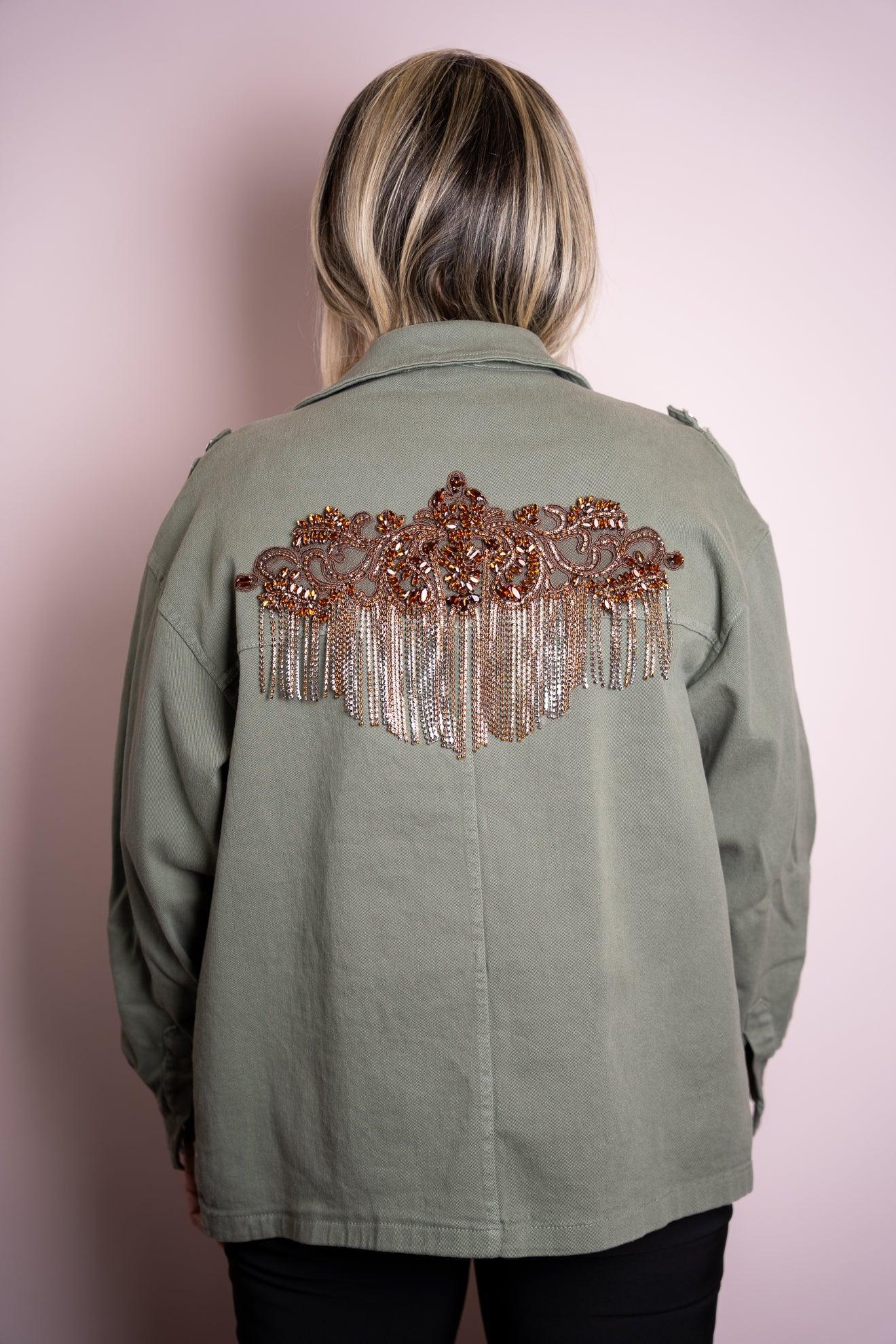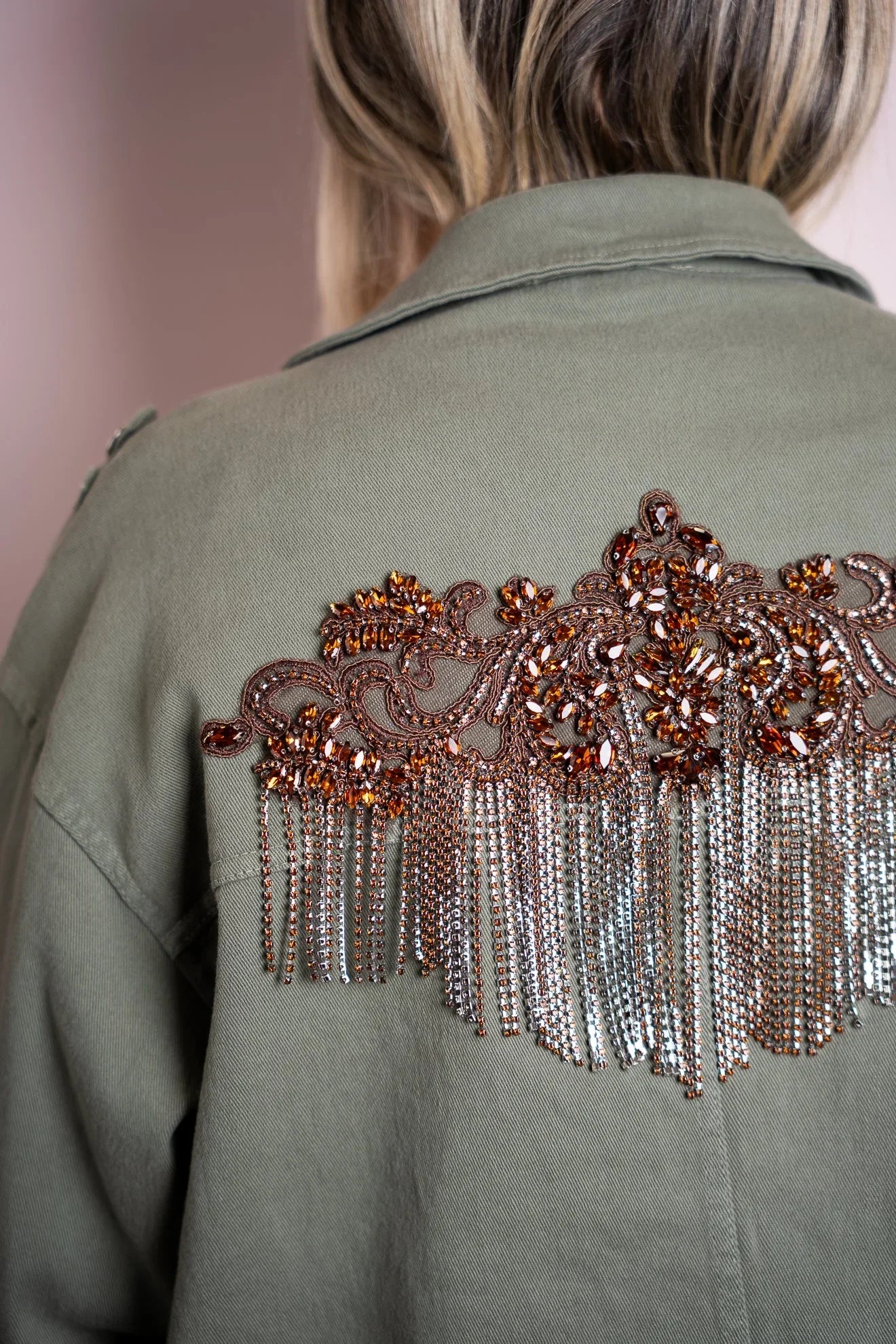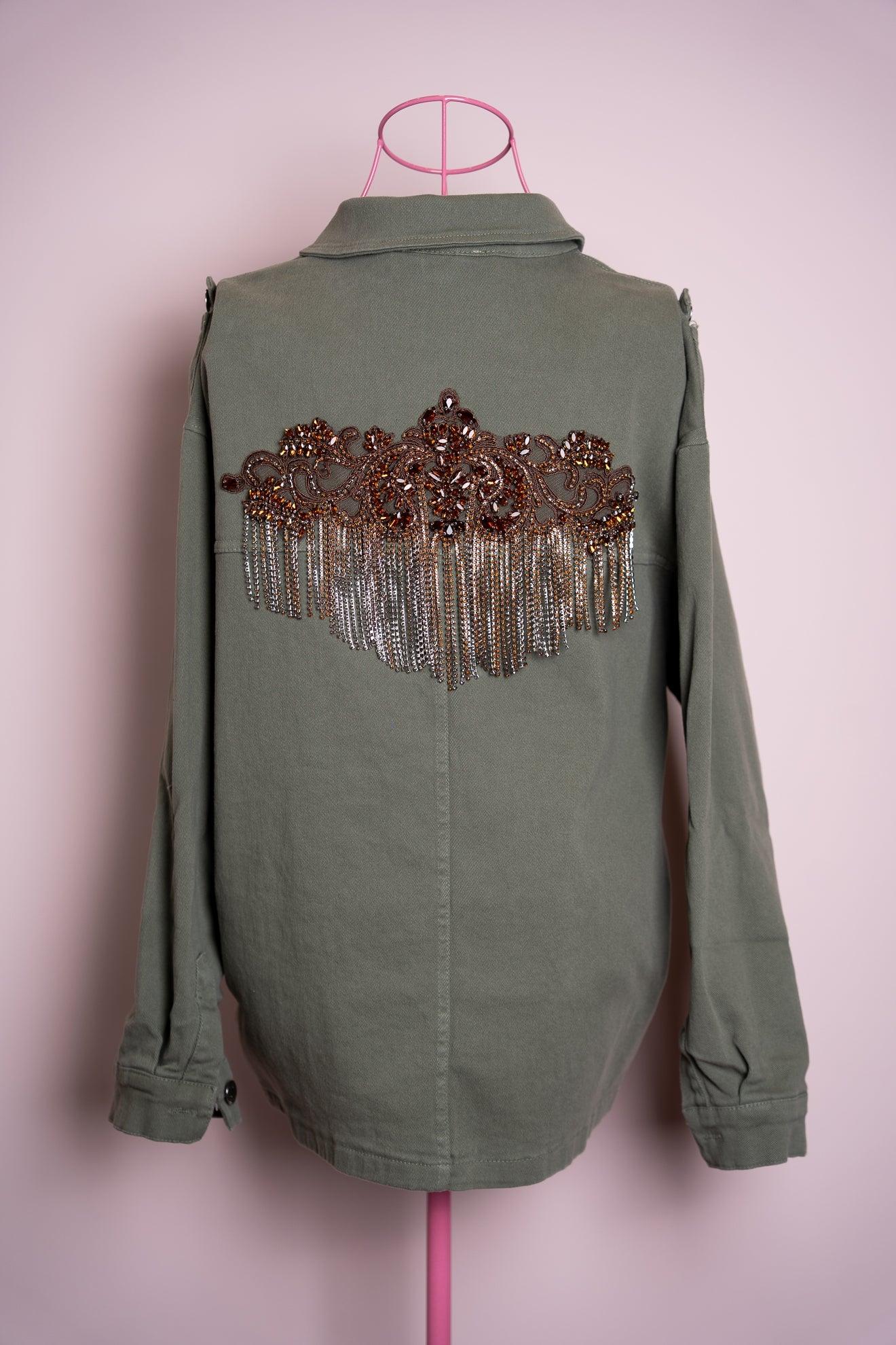 Camicia in denim verde militare con ricamo sulla schiena che impreziosisce il capo, trasformandolo in un pezzo pieno di personalità.