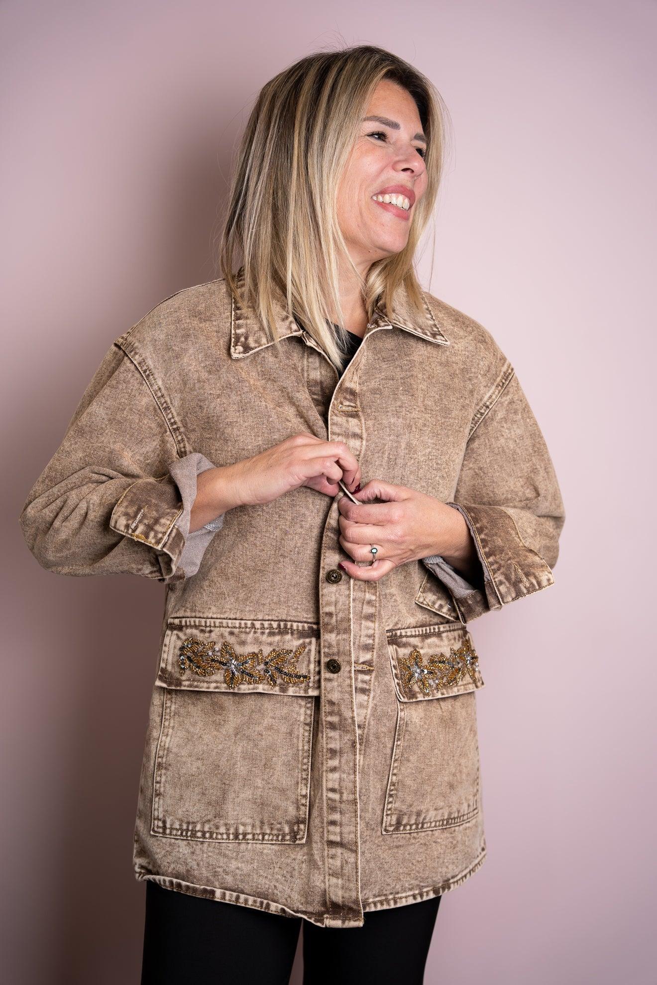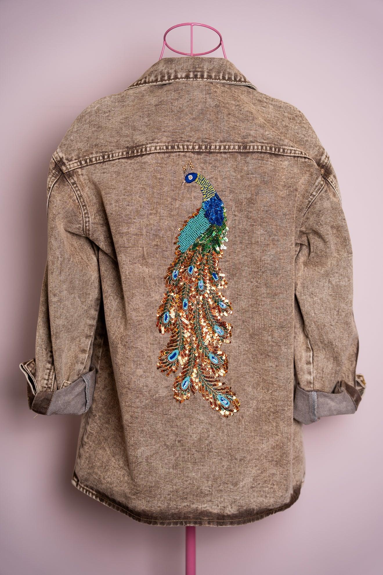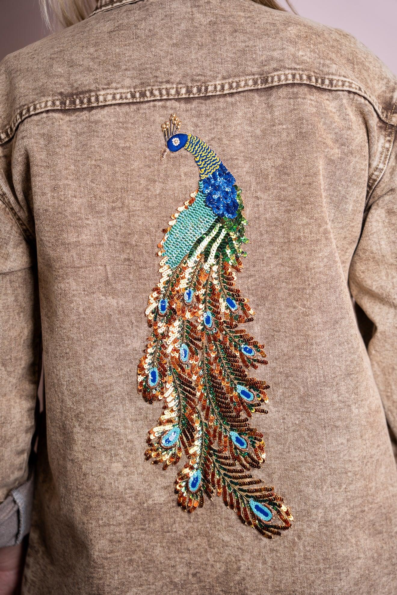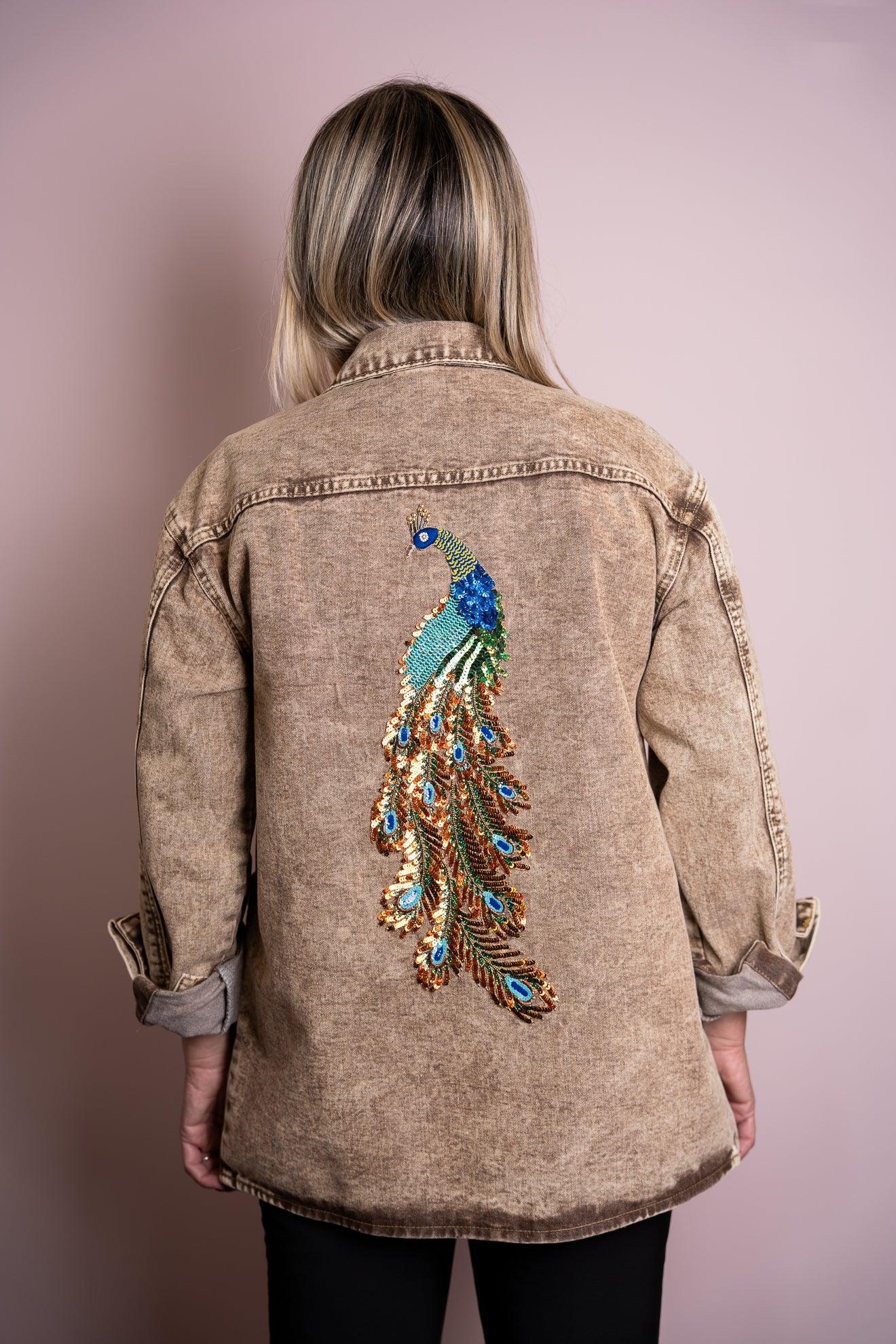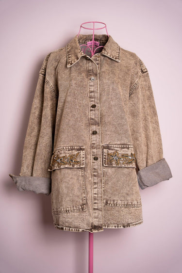 Camicia in denim color sabbia, leggera e versatile, impreziosita da un pavone ricamato sulla schiena. Un dettaglio che illumina il capo e aggiunge carattere a qualsiasi look.