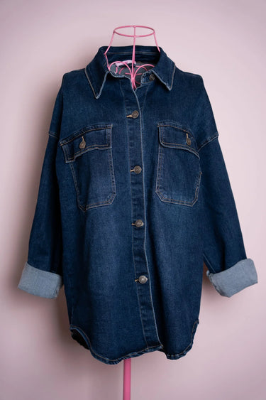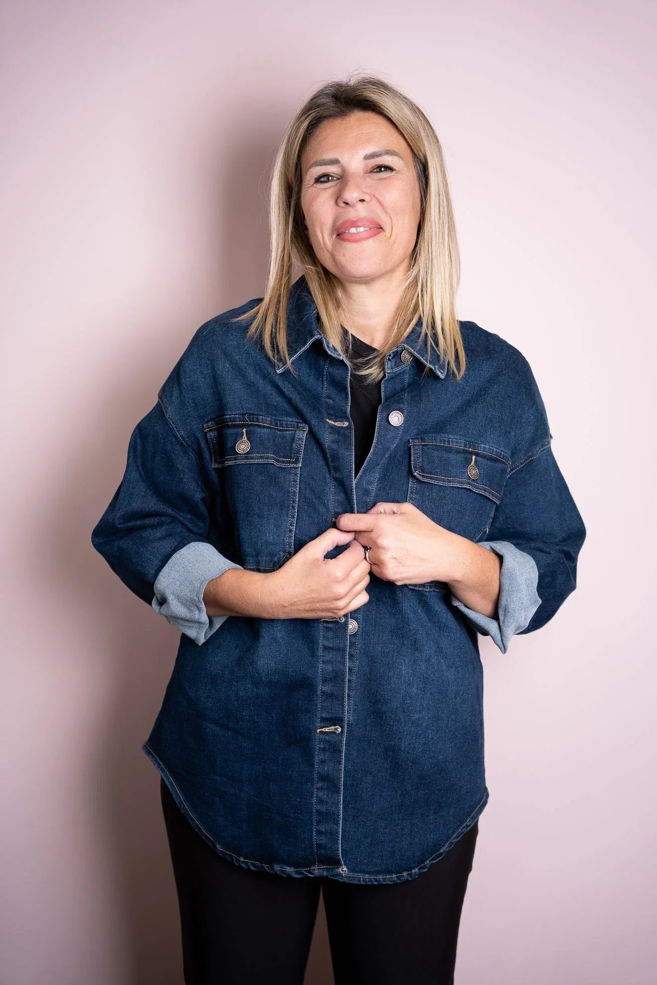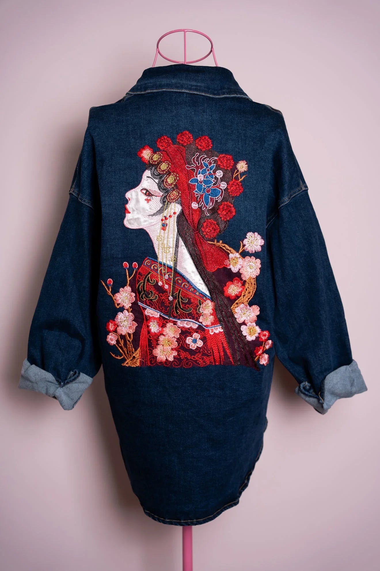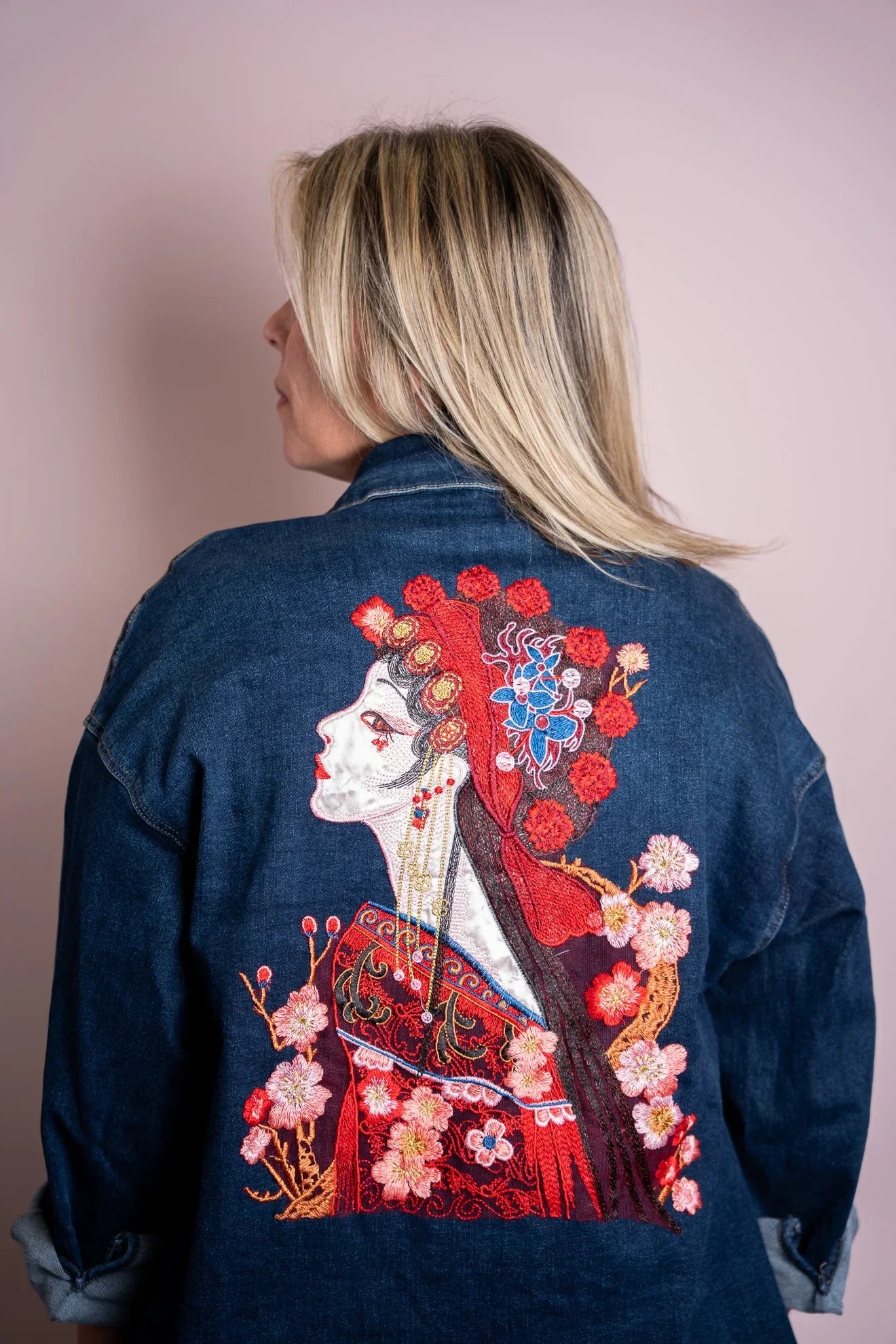 Camicia in denim scuro con ricamo donna giapponese sulla schiena che porta un tocco di colore e originalità, trasformando un capo classico in un pezzo pieno di personalità.
