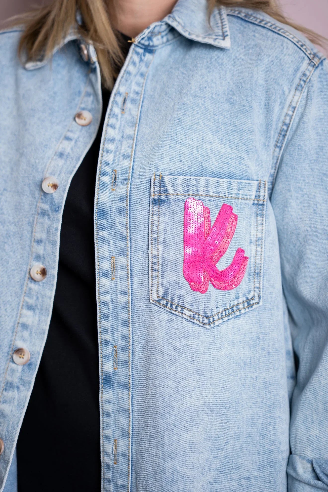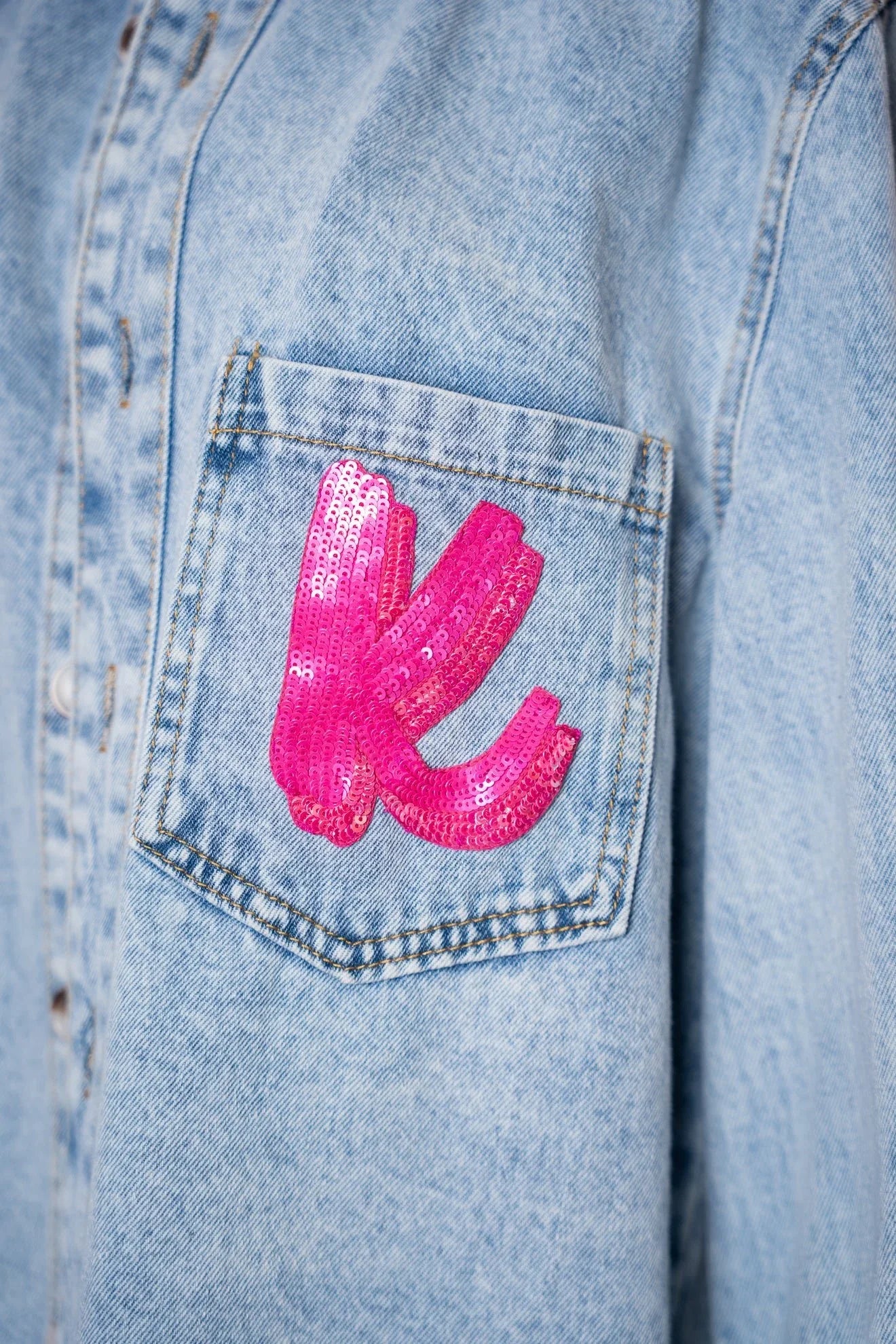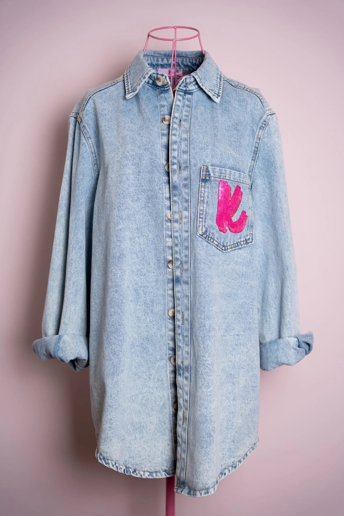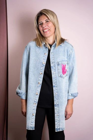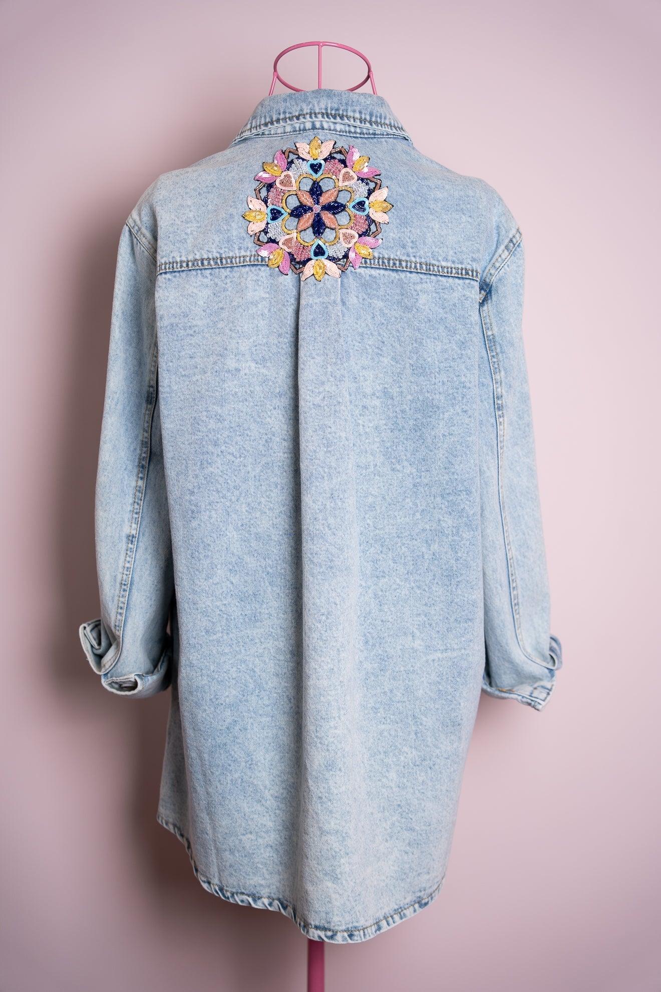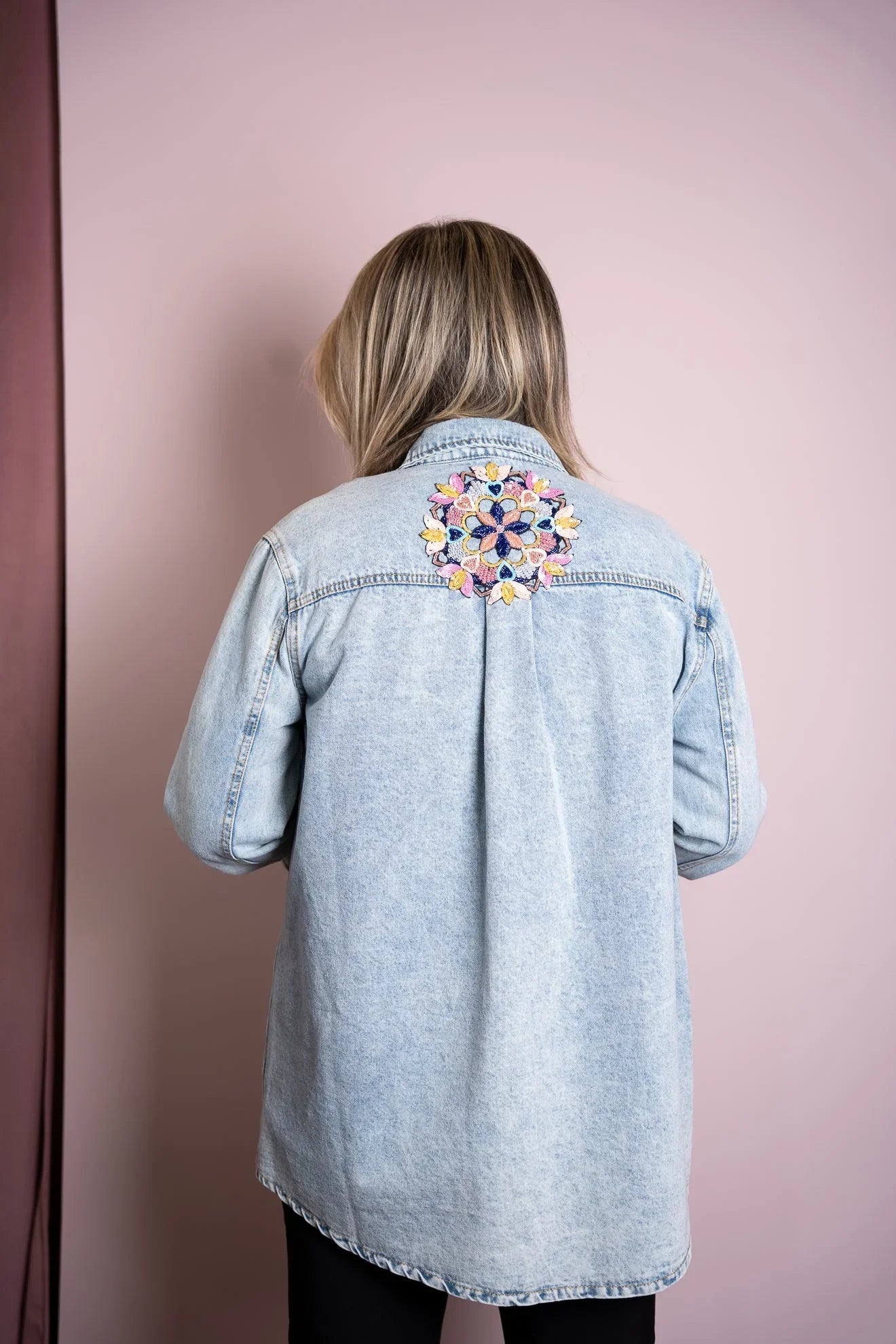 Camicia in denim a lavaggio chiaro, impreziosita dal ricamo della K sulla tasca frontale e da un mandala sulla schiena. Un capo iconico che porta la firma Kiki in ogni dettaglio.