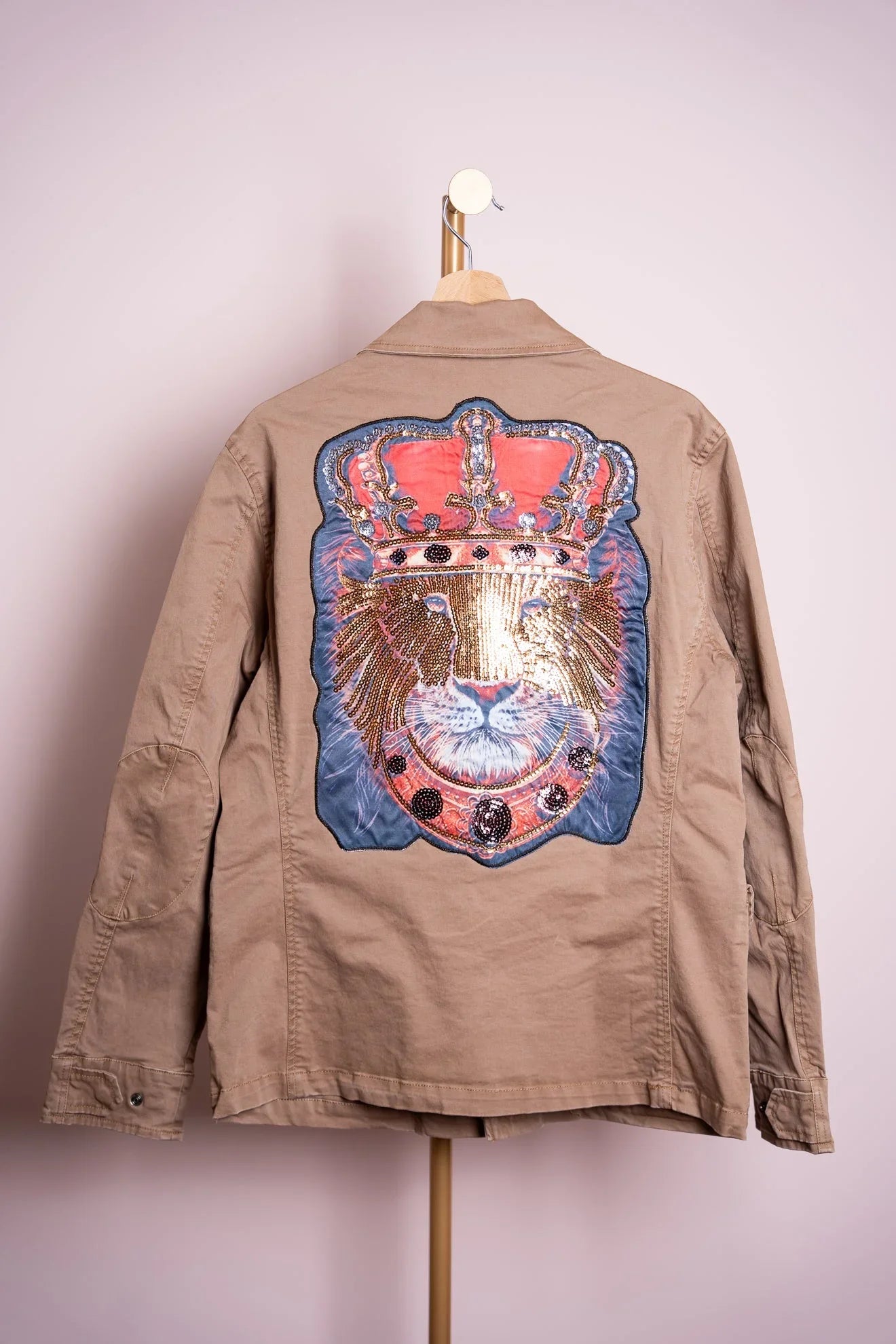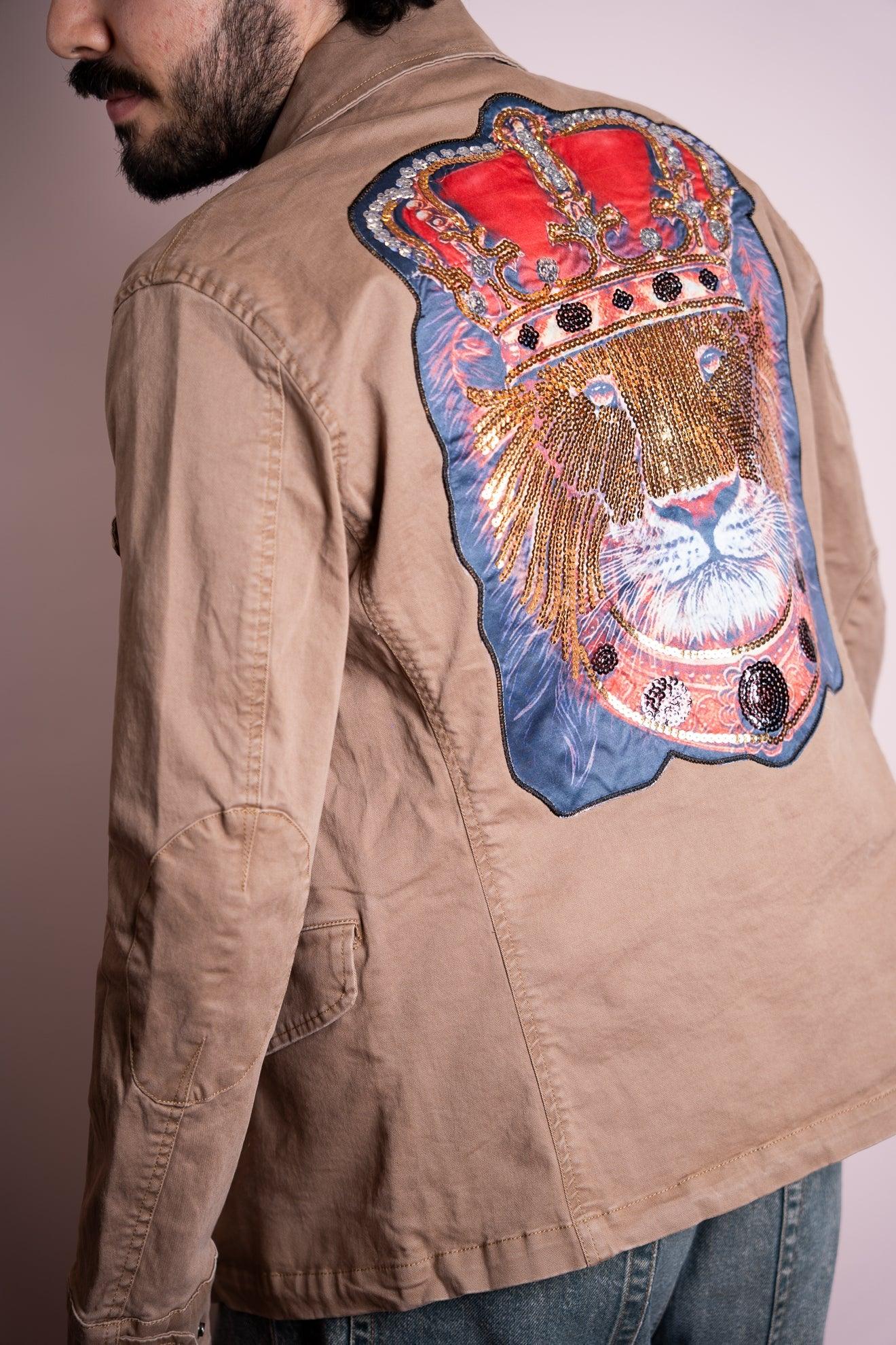 Camicia in cotone beige scuro con un’anima decisa e sofisticata. Sulla schiena, il ricamo del leone incoronato domina la scena in simbolo di forza ed eleganza. Un capo pensato per chi ama distinguersi con stile e personalità.