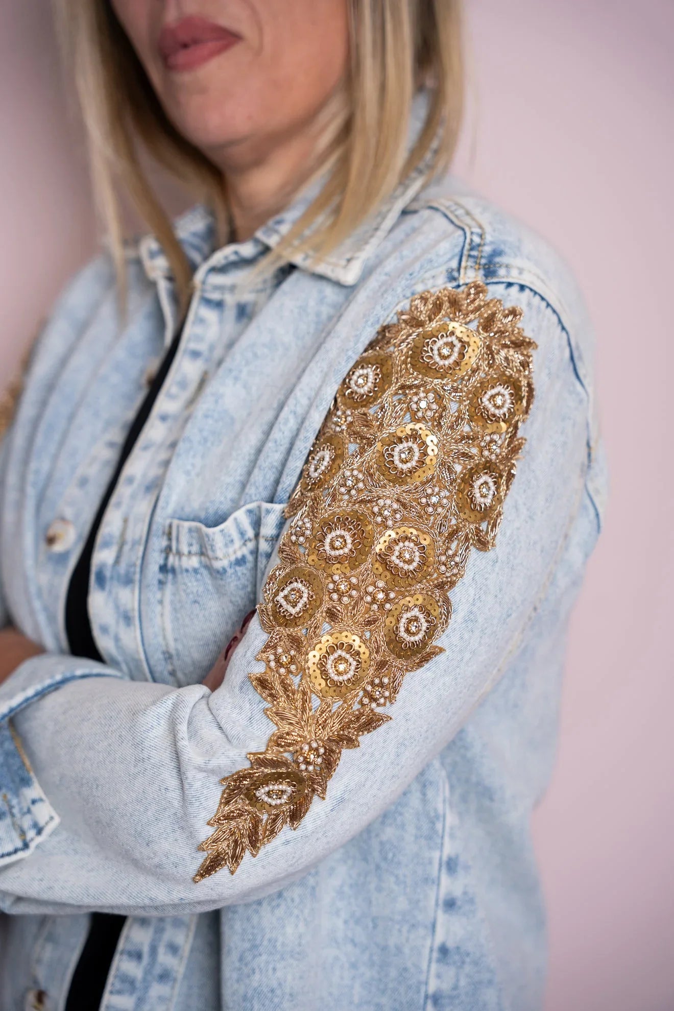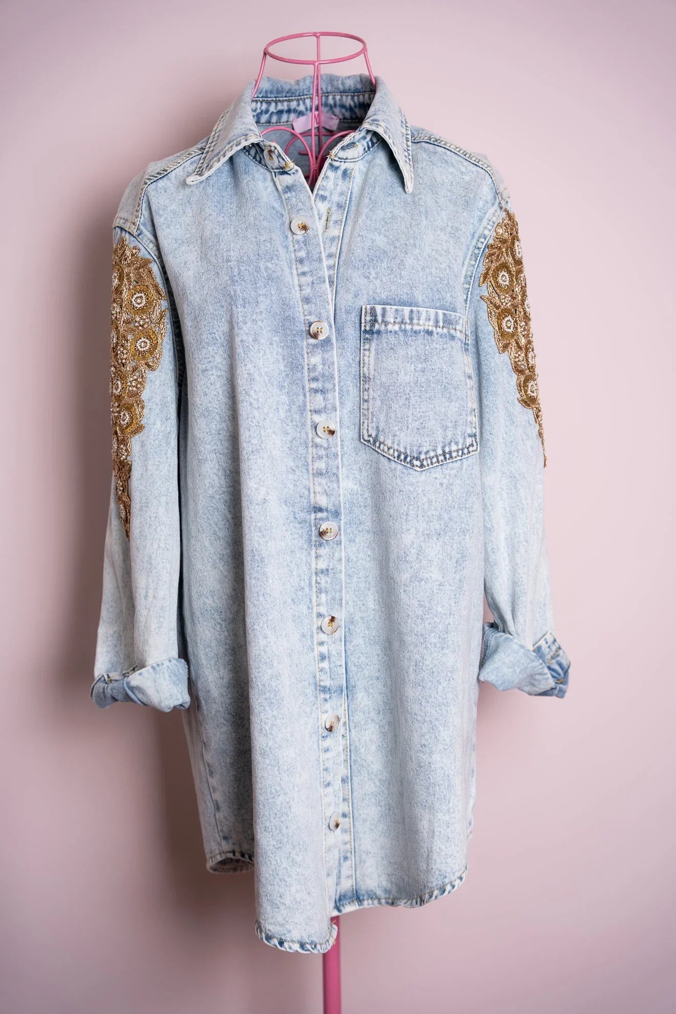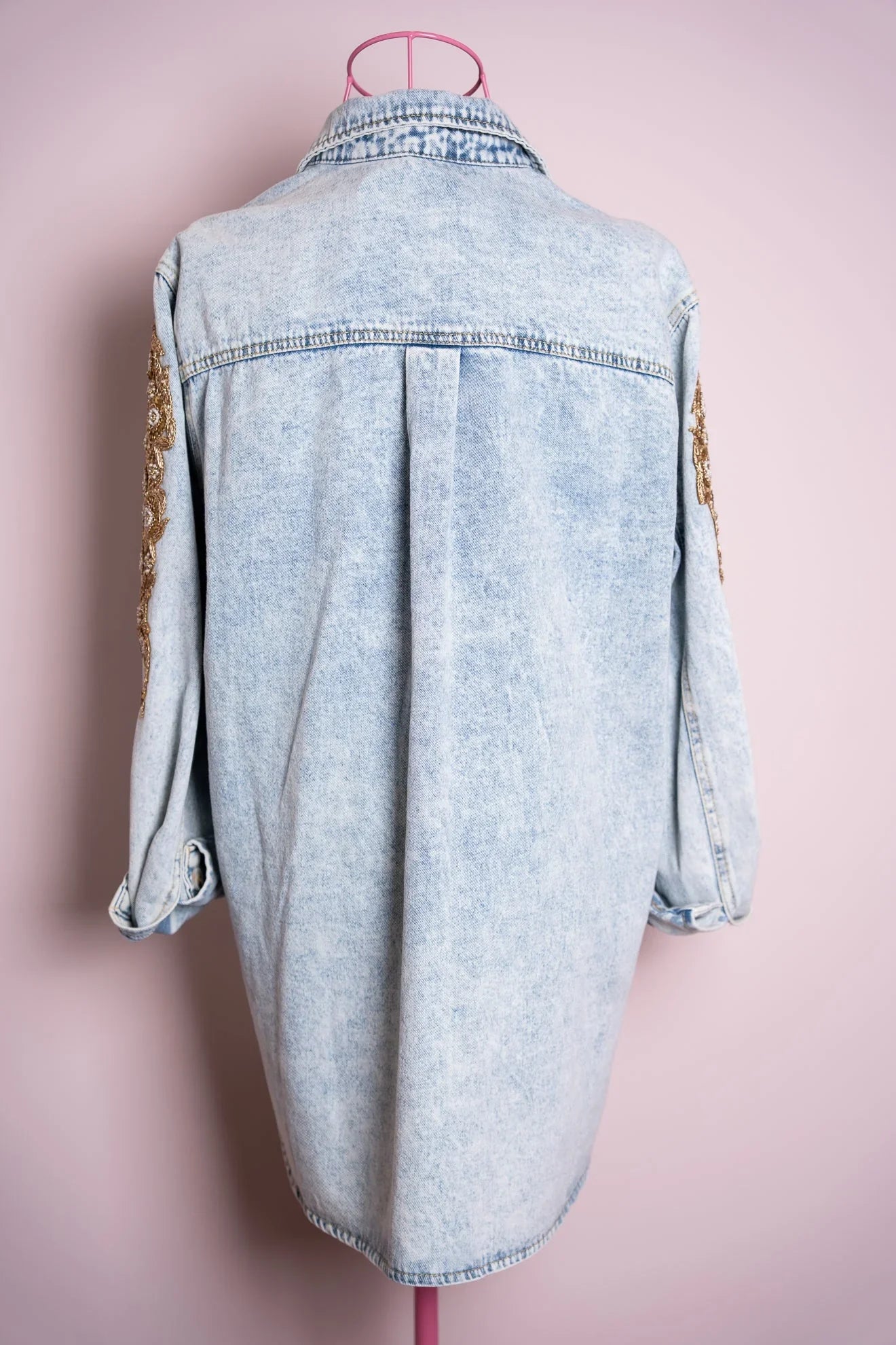 Camicia in denim dal lavaggio chiaro con ricami sulle braccia che impreziosiscono il capo rendendolo originale e unico.