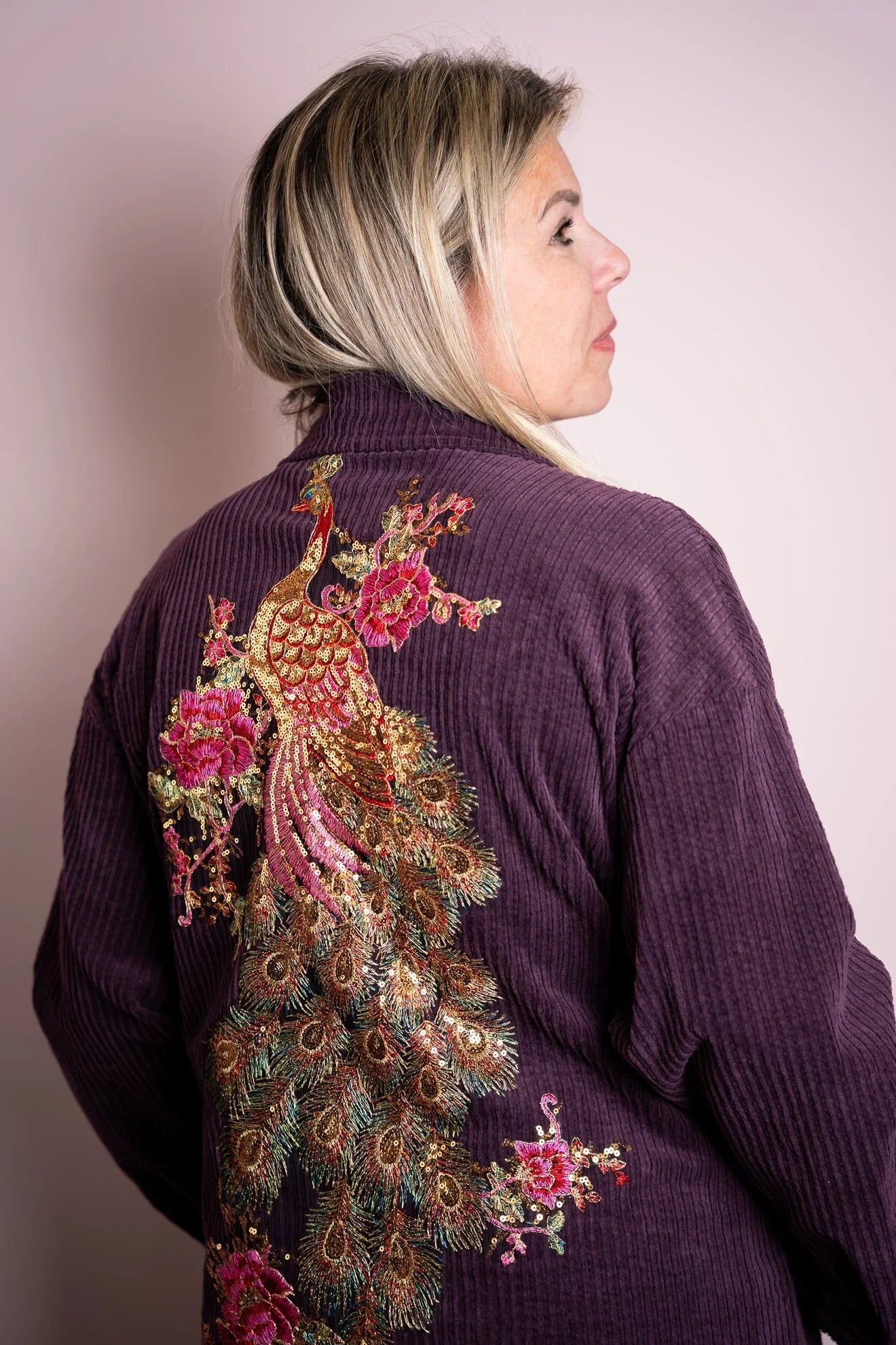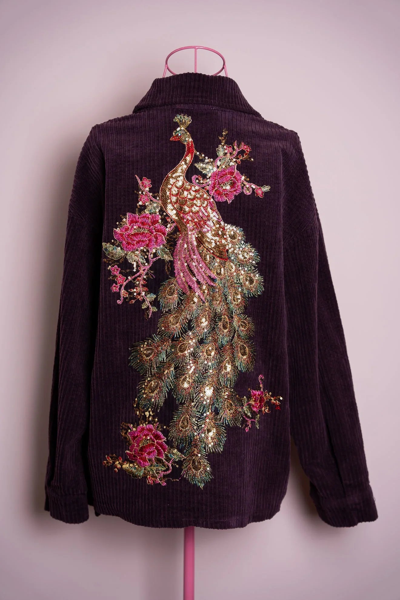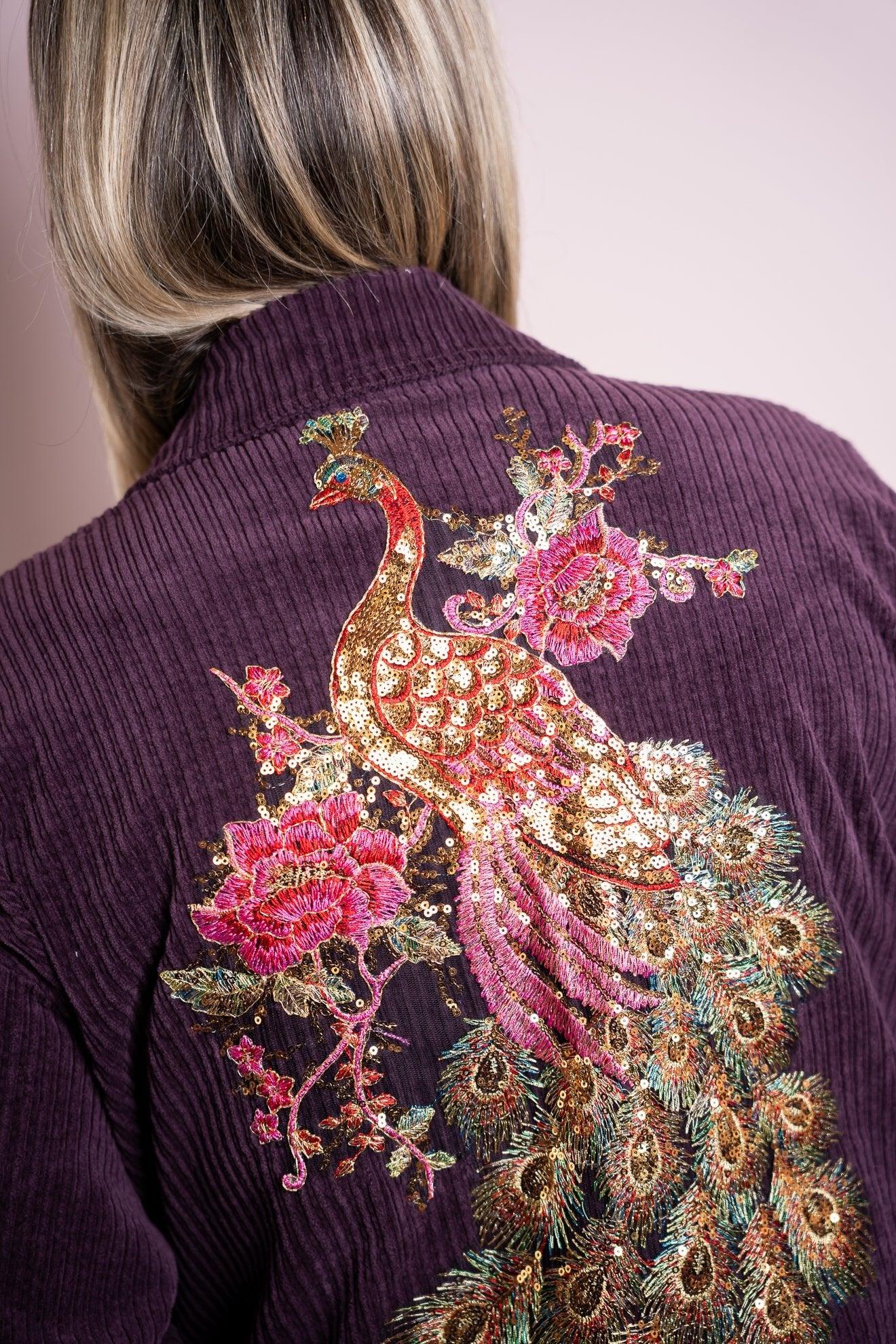 Giacca in velluto con pavone ricamato a mano sulla schiena, un dettaglio che non passa inosservato. Lineare davanti e sorprendente dietro, combina artigianalità e stile deciso, perfetta per chi vuole un capo che parli di forza, personalità e carattere.